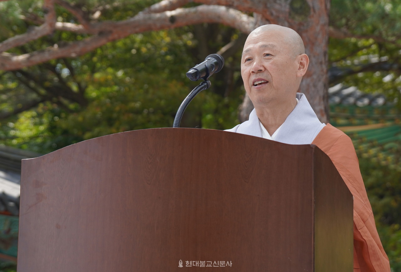 전등사 주지 여암 스님이 환영사를 하고 있다. 주지 여암 스님은 환영사를 통해 함께 우의를 다질 것을 당부했다. 여암 스님은 “선종에는 ‘세계일화(世界一花)’라는 선어(禪語)가 있다. ‘세계는 하나’라는 의미인데, 자비로운 부처님의 눈으로 보면 세상은 꽃과 꽃이 어우러진 하나의 꽃밭과 같다는 것”이라며 “오늘 열리는 행사가 아시아인들이 하나의 꽃밭으로 피어나는 축제”라고 강조했다.