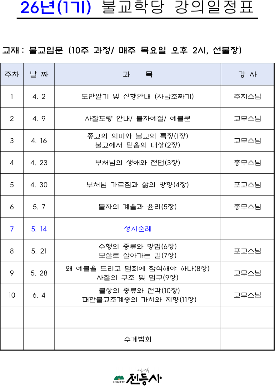 불교학당 - 기본교육과정 - 2023년 1기 수계식 2024년 졸업식 2024년 졸업식 자원봉사 교육목표 부처님의 가르침을 기초부터 배우고 실천하는 삶을 살고자 하는 분들에게 불교의 기본 이론과 실천 체계, 불교 예절 등을 쉽고 친근하게 접할 수 있는 방법을 가르쳐 드립니다. 교육기간 10주 과정 교육내용 불교입문 강의 시간 10주 과정/ 매주 목요일 오후 2시, 선불장